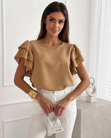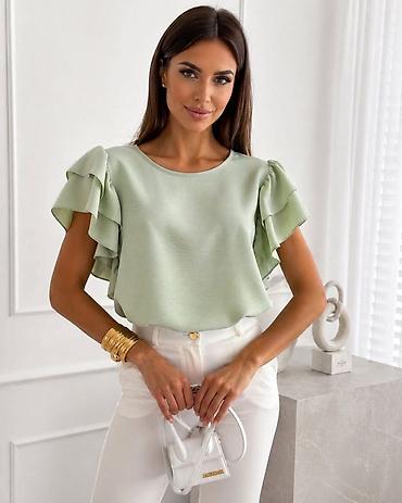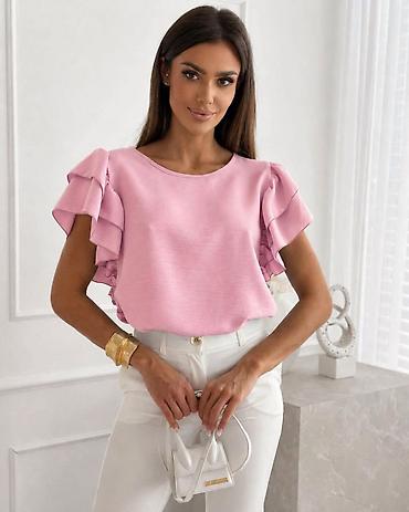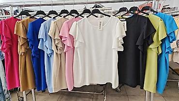 Ženska garderoba – set majica i bluza - Bela pamučna majica sa kratkim rukavima i okruglim izrezom; dekorativna mašna na levoj strani grudi i diskretan ukrasni štep dijagonalno preko ramena. Brend...