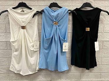 Ženska bezrukavna majica sa visokim okovratnikom i asimetričnim porubom. Model je blago naboran sa jedne strane, što vizuelno ističe struk i daje drapirani efekat. Tkanina je glatka i elastična, sa...