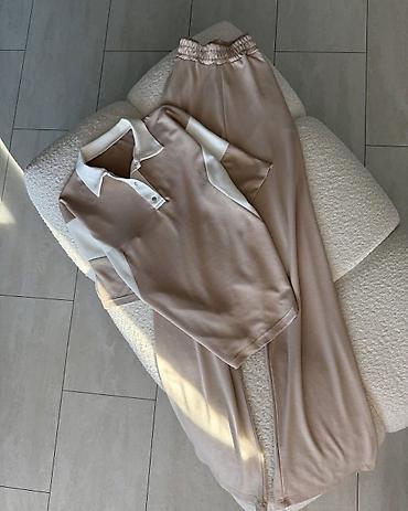 Ženska komplet-trenerka – široke pantalonе i bluzа sa spuštenim ramenom - Dvodijelni set: ležerno elegantna bluza i ravne, široke pantalone. - Kroj: opušten silueta; bluza asimetrična/spušteno ram...