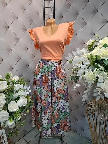 Ženske pantalone širokih nogavica duzina do poda. Visoki struk sa pojasom/trakom za vezivanje; veoma široke nogavice koje elegantno padaju i daju efekat suknje. -Dizajn: više uzoraka u crno‑beloj i...