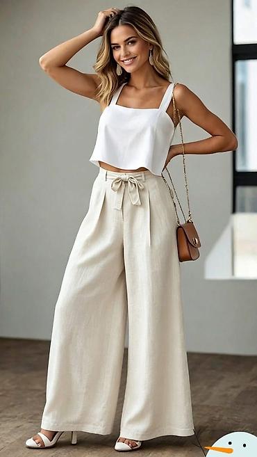 Ženske letnje pantalone širokih nogavica sa pojasom - Kroj: visok struk, široke nogavice (palazzo stil) za lagan, lepršav pad i maksimalnu udobnost. - Pojas: dekorativni tkan pojas u bež boji sa o...