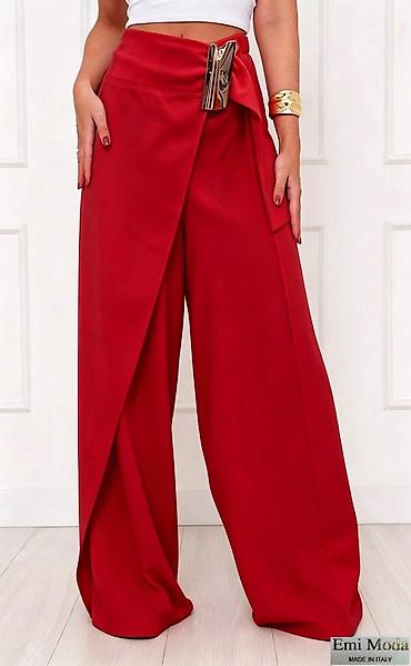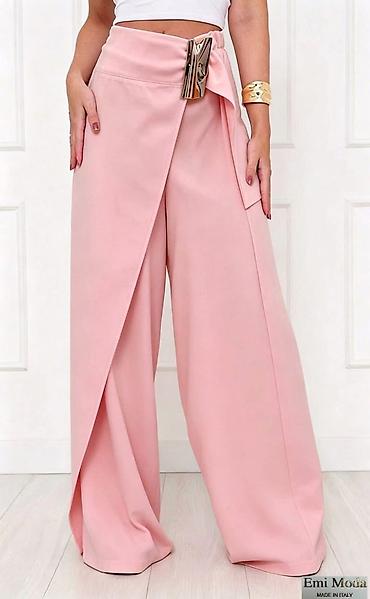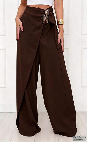 Elegantne ženske pantalone sa visokim strukom i ravnim, širokim nogavicama. Asimetrični preklop preko struka naglašen dekorativnom broš-kopčom u obliku zvezde/Sunca daje sofisticiran, ženstven izgl...