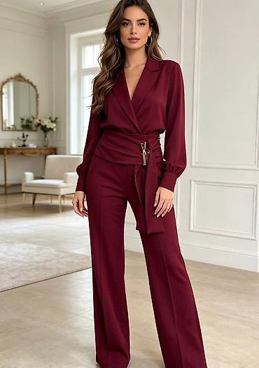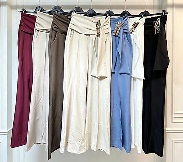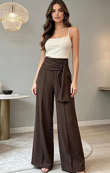 Ženske široke pantalone visokog struka sa mašnom - Kroj: wide leg (široke nogavice), visok struk, plisirani prednji deo za lep pad i dodatnu udobnost. - Pojas: dekorativna i funkcionalna traka/maš...