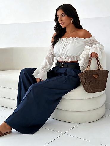 Ženske široke lepršave pantalone sa visokim strukom - Kroj: izrazito široke nogavice (palazzo), visok struk, lagano plisirane napred za dodatni volumen i eleganciju - Pojas: dekorativni kaiš/šal s...