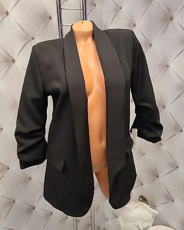 Sako – veličina M - Klasičan crni ženski sako bez kopčanja, lagano strukiran - Dugi rukavi sa dekorativnim dugmićima na manžetnama (po tri dugmeta) - Rever bez kragne za moderan, čist izgled - Dže...