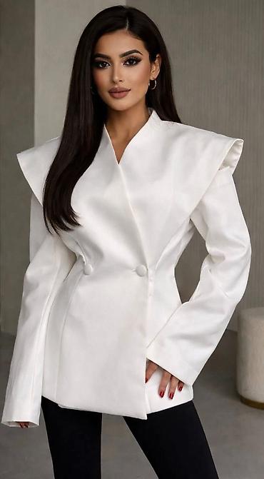 Elegantni ženski blejzer od tvida, dužine do kukova, sa dvorednim kopčanjem na dekorativna zlatna dugmad. Klasičan rever sa širokim kragnama, blago strukiran kroj, dugi rukavi. Prednji deo sadrži d...