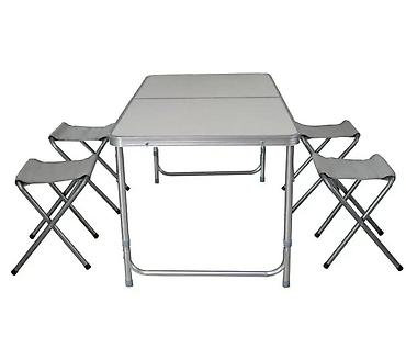 Praktičan i kompaktan sklopivi kamping set – sto i 4 stolice u jednom koferu.