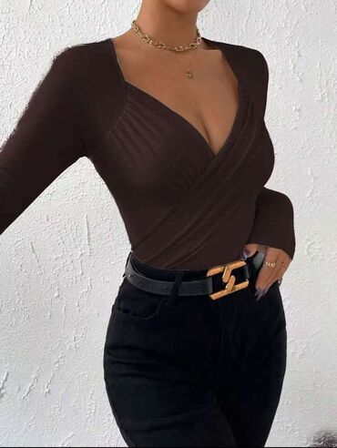 Ženska bluzica/majica sa dugim rukavima, u metalik zlatnoj boji. - Kroj: preklopni V-izrez sprijeda (wrap stil) sa blago skraćenom dužinom do struka. - Materijal: sjajna, plisirana/teksturirana tka...