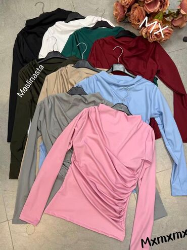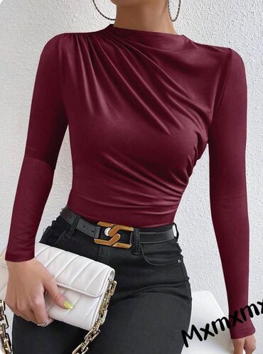 Ženska bluzica s dugim rukavima – asimetrični kroj i nabran struk - Model: uska bluzica sa polo/visokim okovratnikom, asimetričnim ramenom i dekorativnim naborima duž jedne strane koji naglašavaju...