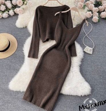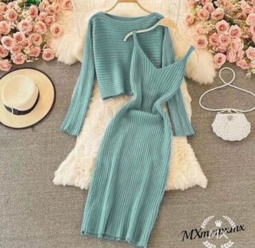 Pleten komplet (džemper i pantalone) u svetloplavoj nijansi. - Gornji deo: rolka sa širokim rebrastim ovratnikom, opušten kroj, blago talasasti porub. Rukavi ukrašeni nizom dekorativnih dugmadi u ...3 000 RSD