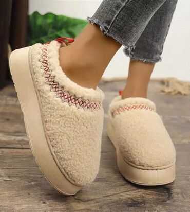Bež papuče sa platformom i ukrasnim veštačkim krznom. Ove moderne papuče su udobne i praktične za nošenje u kući ili kao modni detalj.