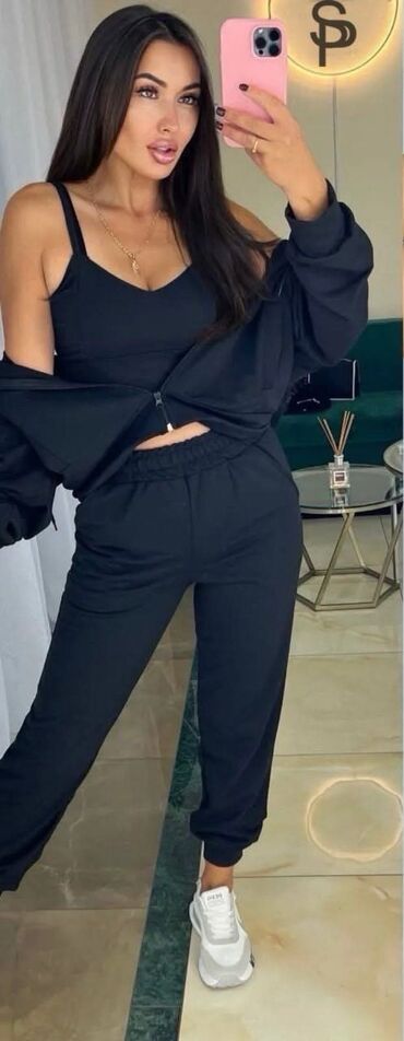 Ženski dvodelni trenerka set sa rajsferšlusom. - Model: jakna sa visokim kragnom i ranflama + donji deo ravnog kroja sa ranflama na člancima - Dekoracija: traka sa monogram motivom duž rukava i no...