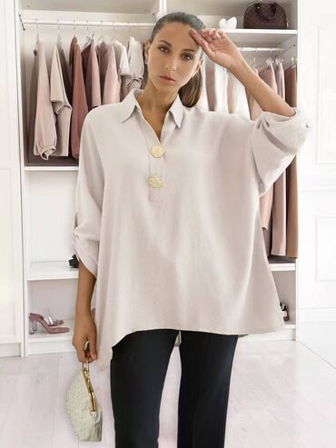Ženska bluza u boji puder roze. - Kroj: ravna silueta, dužina do kukova. - Izrez: V-izrez sa dekorativnim izrezom/otvorom ispod vrata; visoka kragna koja se zakopčava sa dve kukice pozadi. - Rukav...700 RSD