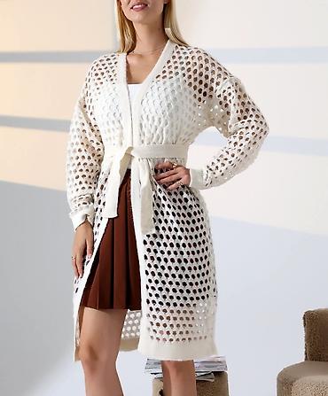 Ženski kardigan/kimono jaknica u bež (krem) boji. Otvorenog kroja bez kopčanja, sa širokim pojasom za vezivanje u struku. Dugi rukavi, ravni rubovi, meka i glatka tkanina prijatna na dodir. Minimal...