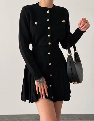 Pleten komplet (džemper i pantalone) u svetloplavoj nijansi. - Gornji deo: rolka sa širokim rebrastim ovratnikom, opušten kroj, blago talasasti porub. Rukavi ukrašeni nizom dekorativnih dugmadi u ...3 000 RSD
