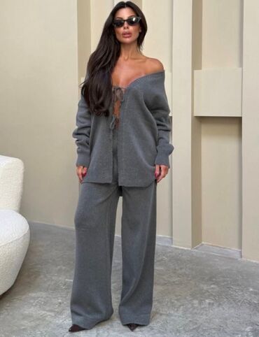 Pleten komplet (džemper i pantalone) u svetloplavoj nijansi. - Gornji deo: rolka sa širokim rebrastim ovratnikom, opušten kroj, blago talasasti porub. Rukavi ukrašeni nizom dekorativnih dugmadi u ...