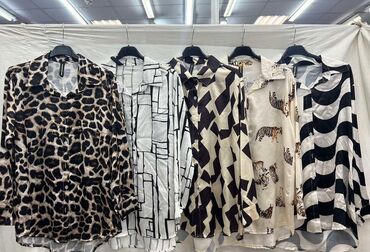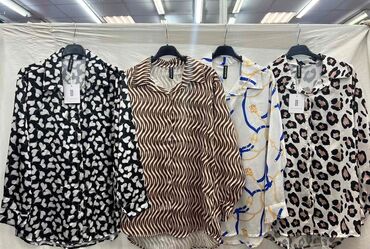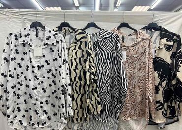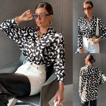 Ženske košulje – dva modela - Model 1: Crno‑siva košulja sa bogatim paisley/ornamentalnim printom. Klasičan kragnasti okovratnik, dug rukav, blago V-izrezano kopčanje sprijeda sa skrivenim dugmadi...