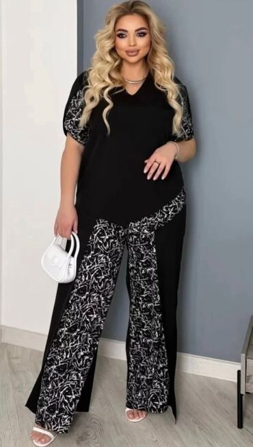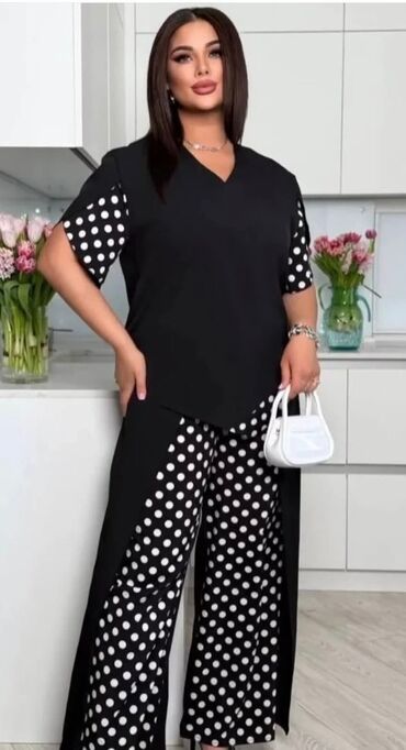 Dvodijelni ženski pleteni komplet – duks i pantalone širokih nogavica. - Materijal: mekani pleteni triko, elastičan i udoban za celodnevno nošenje. - Gornji deo: ravni okrugli izrez, spuštena rame...