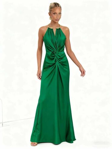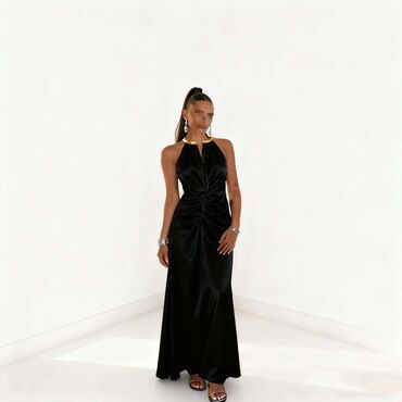 Elegantna večernja haljina – crna, duga, sa dramatičnim šlepom i visokim šlicem. - Kroj: sirena/suknja sa naborima napred, visoki otvor na butini, produženi asimetrični šlep sa strane. - Gornji de...