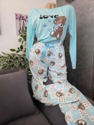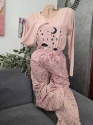 Ženski komplet pidžame u roze boji, izrađen od satena. Komplet se sastoji od pantalona sa volanima na rubovima, majice na bretele ukrašene čipkom na dekolteu, i ogrtača sa čipkom na rukavima i vola...