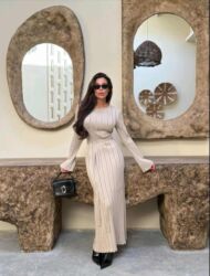 Elegantna haljina bez rukava, midi dužine, u taupe/sivoj boji. Model