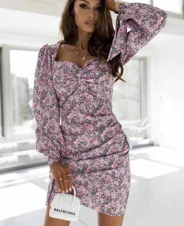 Haljina sa dugim rukavima i V-izrezom, zanimljivog asimetričnog/“bubble” kroja sa naborima oko struka i kukova. Print u tamnoljubičastim, bordo i belim tonovima, prednji i zadnji deo u istom motivu...