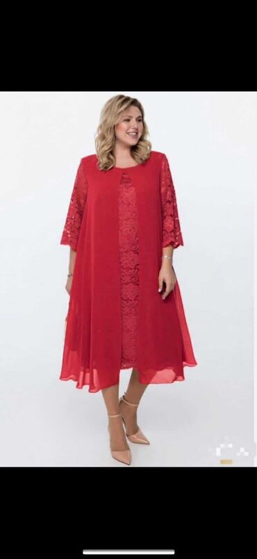 Duga večernja haljina u jarko crvenoj boji. Model je bez bretela, sa srcolikim izrezom na grudima. Gornji deo je glatkoga kroja sa horizontalnim šavom u struku, a donji deo je A-kroja sa blagim nab...