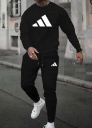 Muški komplet trenerke – gornji deo sa rajsferšlusom i donji deo sa uskim nogavicama - Brend stil: Adidas (logo na grudima i butini, tri pruge duž rukava i nogavica) - Dizajn: sportsko-urbani, sli...