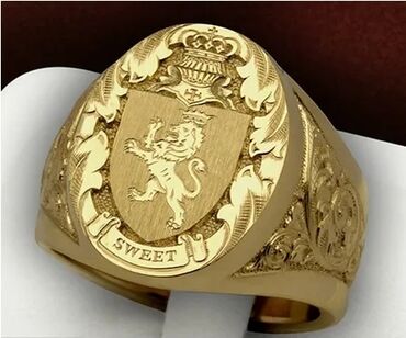 Masivni muški prsten – žuta boja metala, širokog profila. Prednja