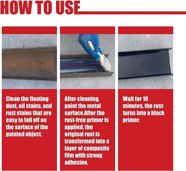 【Jednostavna upotreba】: Obrišite prašinu i mrlje od vode sa metalne površine, nanesite sredstvo za čišćenje rđe četkom (uključeno) i sačekajte 20 minuta da se osuši. Brzo formirajte zaštitni film, sprečite rđu više puta. Nema više struganja, peskarenja ili brušenja!