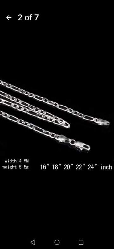 Srebrne narukvice, ogrlice, lančići, nanogice– razni modeli - Materijal: srebro (više tipova i debljina lanaca) - Dizajni lanaca: Figaro, karika/oval, pancer, riblja kost, puž, forzatina, pletena ...