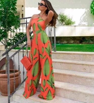 Elegantni ženski kombinezon sa širokim nogavicama - Kroj: struk naglašen, gornji deo sa tankim bretelama i V-urezom na dekolteu; pantalone široke, sa dekorativnim preklopima/ panelima napred koji ...