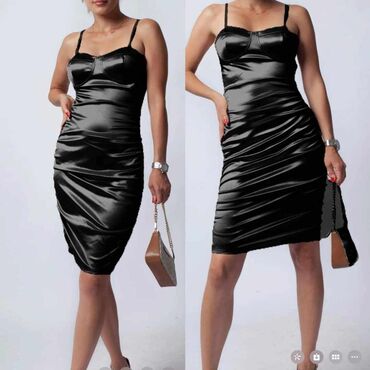 Elegantna večernja haljina – crna, duga, sa dramatičnim šlepom i visokim šlicem. - Kroj: sirena/suknja sa naborima napred, visoki otvor na butini, produženi asimetrični šlep sa strane. - Gornji de...