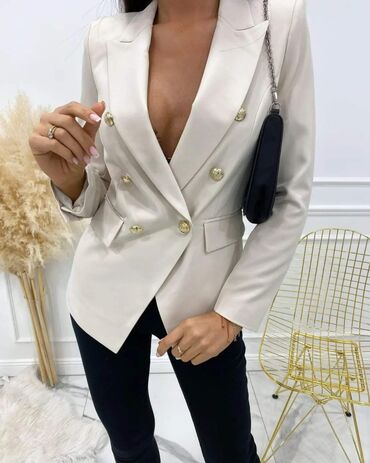 Ženski elegantni komplet – sako i pantalone - Model: dvoredni sako sa zlatnim dekorativnim dugmadima i usklađene ravne pantalone - Kroj: strukirani sako sa reverima, dugmad u dve kolone; džepovi s...