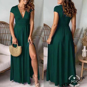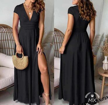 Elegantna večernja haljina – crna, duga, sa dramatičnim šlepom i visokim šlicem. - Kroj: sirena/suknja sa naborima napred, visoki otvor na butini, produženi asimetrični šlep sa strane. - Gornji de...