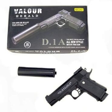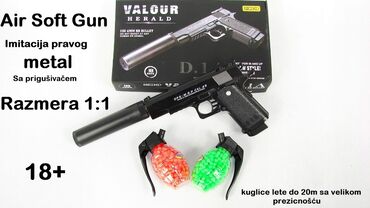 Valor herald dečiji pištolj sa prigušivačem je verna (metal/plastika) replika pištolja koji koristi 6mm vodene i plastične kuglice kao metkiće za pucanje. U setu se dobija: