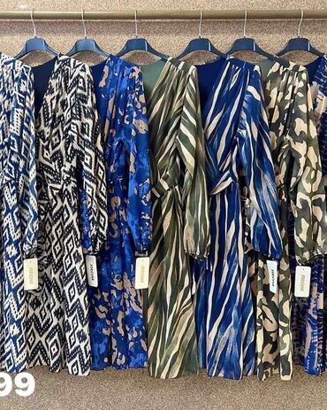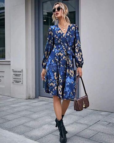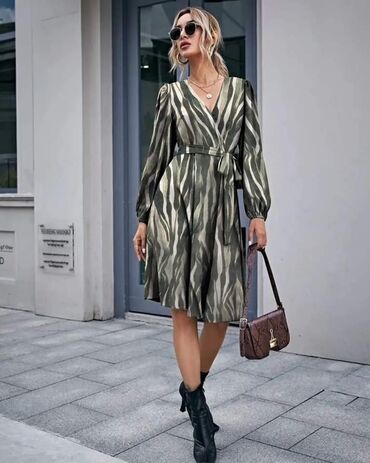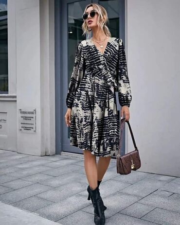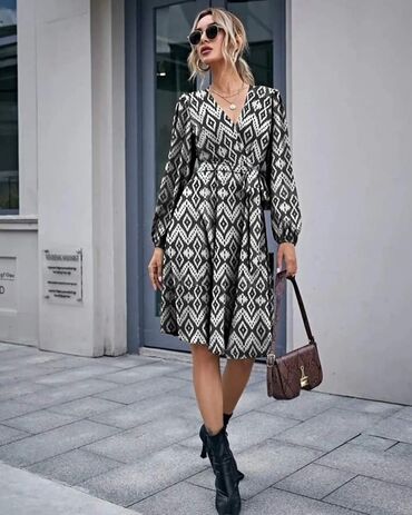 Ženska haljina/kaput-haljina sa printom Velicina 50 - Kroj: A-linija, dužina do ispod kolena; kratki rukavi. - Kopčanje: prednje kopčanje na dugmad. - Kragna: klasična, sa reverima. - Materijal: gl...