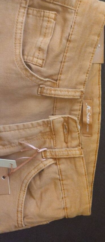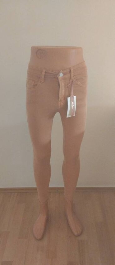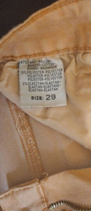 Roze, sa etiketom M.SARA farmerke vel 29. Imaju tri džepa napred i dva pozadi. Sastav 67 posto pamuk, 31 posto poliester i 2 posto elastin. Idu uz nogu celom dužinom. Mere su bez rastezanja.