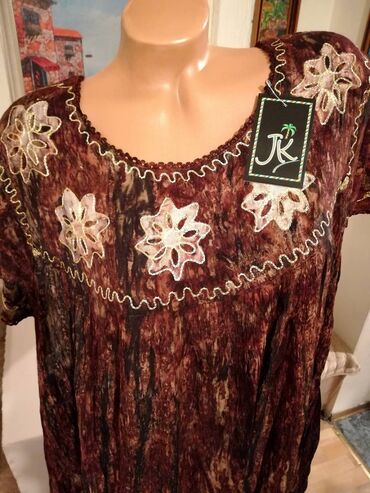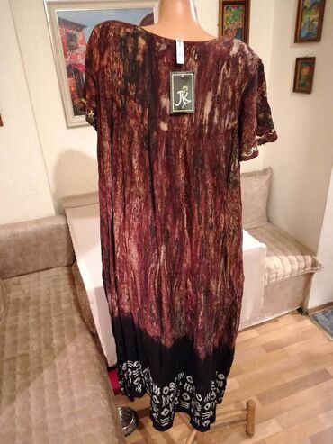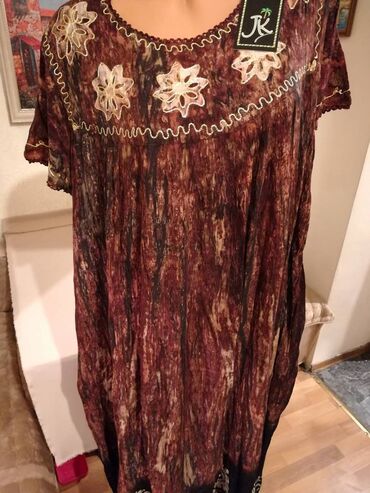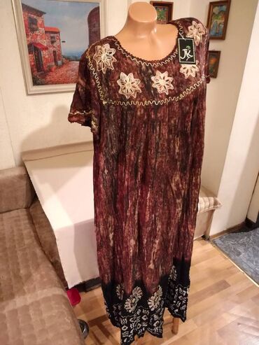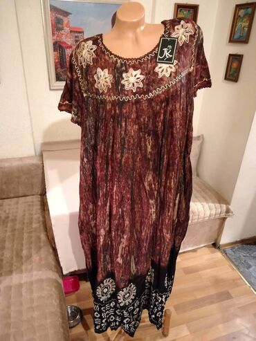 Nova zenska indijska haljina za punije dame Nini. Indijska. Odlicna indijska zenska haljina za punije devojke i dame svih generacija. Vrlo lepog dezena, prijatna za nosenje, uradjena od veoma kvalitetnog materijala. Moze se nositi u svim prilikama. Haljina je uradjena od laganijeg materijala, idealna za svecane prilike. Haljina poseduje zlatni ukrasni vez u formi ruza napred na grudima i ramenima kao i lepu saru pri dnu haljine sa prednje strane. Haljina, takodje, poseduje i dzepove na bokovima. Idealna zenska haljina za svecane i posebne prilike. Indijska haljina za punije dame Nini je nova sa etiketom.