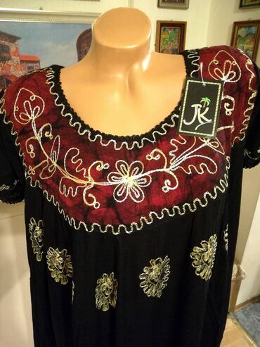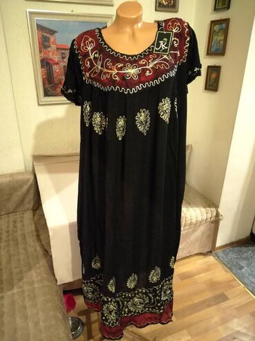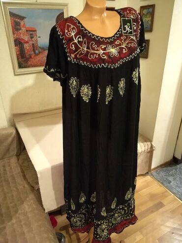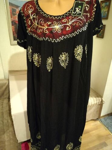 ViskozaNova zenska indijska haljina za punije dame Nini. Indijska. Odlicna indijska zenska haljina za punije devojke i dame svih generacija. Vrlo lepog dezena, prijatna za nosenje, uradjena od veoma kvalitetnog materijala. Moze se nositi u svim prilikama. Haljina je uradjena od laganijeg materijala, idealna za svecane prilike. Haljina poseduje zlatni ukrasni vez u formi ruza napred na grudima i ramenima. Takodje, haljina poseduje i dzepove na bokovima. Dobra zenska haljina za svecane i posebne prilike. Indijska haljina za punije dame Nini je nova sa etiketom.