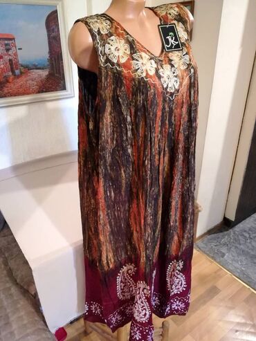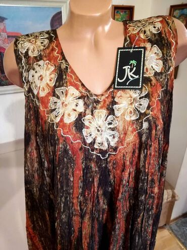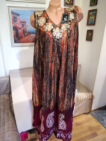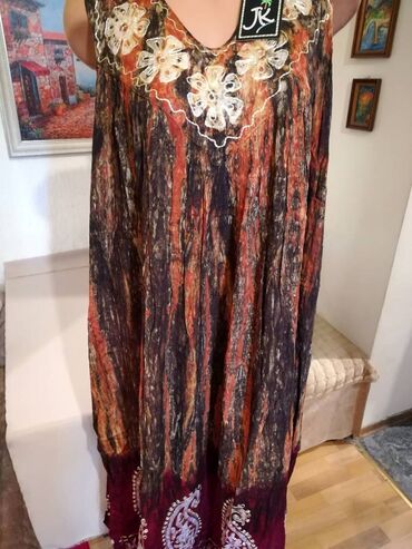 ViskozaNova zenska indijska haljina bez rukava za punije dame Nini. Indijska. Odlicna indijska zenska haljina za punije devojke i dame svih generacija. Vrlo lepog dezena, prijatna za nosenje, uradjena od veoma kvalitetnog materijala. Moze se nositi u svim prilikama. Haljina je uradjena od laganog i prijatnog materijala, idealna za svecane prilike. Haljina poseduje zlatni ukrasni vez u formi ruza napred na grudima i ramenima. Odlicna zenska haljina za svecane i posebne prilike. Indijska haljina bez rukava za punije dame Nini je nova sa etiketom.