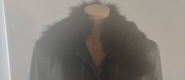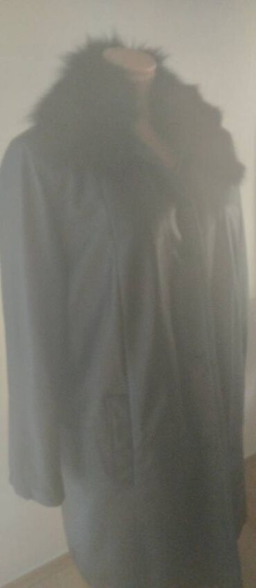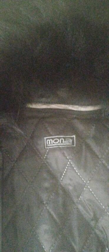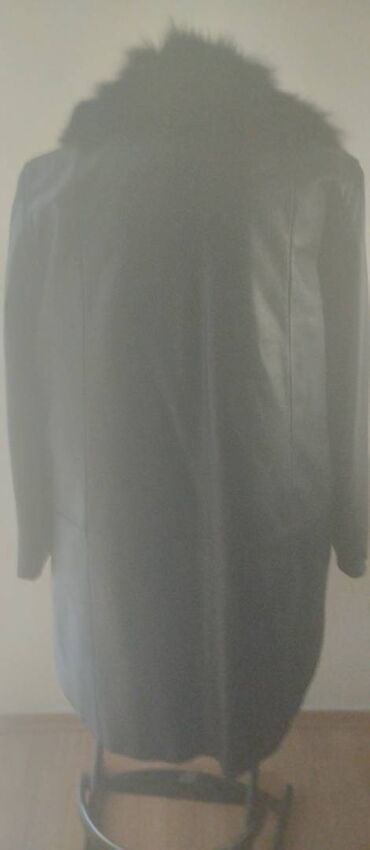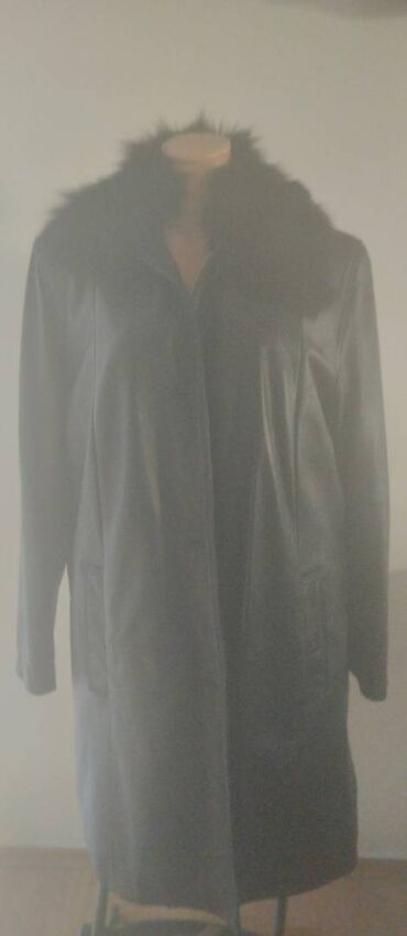 Očuvan crni kožni MONA mantil vel 44. Ima postavu koja se skida. Oko vrata je krznena kragna koja se takođe skida. Ima dva džepa.