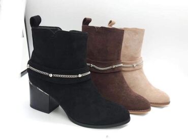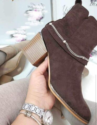 Ženske poluduboke čizme – elegantni modeli sa potpeticom - Stil: ankel čizme, modernog dizajna sa dekorativnom metalnom kopčom oko članka - Materijal gornjišta: imitacija brušene kože (crni model)...