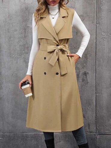 Ženska prošivena prsluk-jakna bez rukava, boja tamna čokolada. - Kroj: struk naglašen pojasom koji se vezuje u mašnu/čvor; blago A silueta. - Materijal: glatka, sjajnija tkanina sa laganim punjenj...