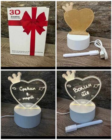 O trošku kupca3D lampe na USB napajanje sa postoljem od 4cm i pleksiglasom u obliku srca dimenzije 13x11,5cm, sa lampama dolazi olovka kojom se na pleksiglasu moze pisati i brisati tekst koji kada se upali lampa veoma lepo svetli. Dolazi u kreativnom pakovanju idealnom za poklon. Cena samo 950 dinara. Hc