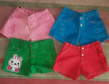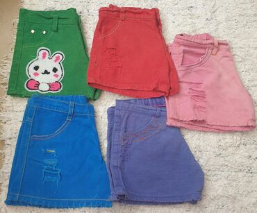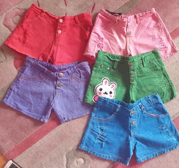 Upotrebljenо5 kom - 1250 din. Moderan letnji sorts za devojcice, fabricki iscepan. Plavi, zeleni, roze, crveni u ljubicasti. Komad 300 dinara. Oko 6-8 godina. Plave zelene i crvene boje noseni bas malo. Ljubicaste i roze vise.