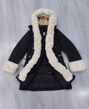 Ženska parka jakna sa krznenim detaljima - Model: duža parka sa kapuljačom - Spoljašni materijal: crna tkanina (vodoodbojni izgled), meko veštačko krzno u bež/šampanj tonu - Detalji od krzna: širo...