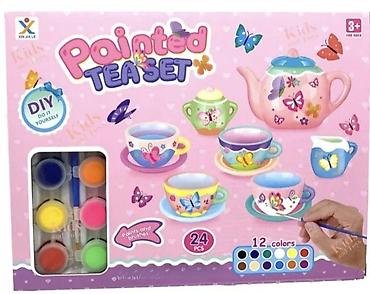 Set sadrži: čajnik, bokal za mleko, posudu za šećer, 4 šoljice, 4 tanjira, 12 boja i četkicu za bojenje
