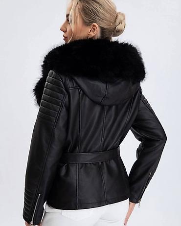 Ženska crna jakna sa kapuljačom i bogatim krznanim obrubom