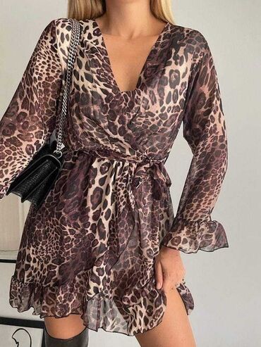 Crna elegantna haljina sa prozirnim rukavima sa animal printom. - Kroj: ravna linija sa blagim A-širenjem prema dole, midi dužina. - Gornji deo: okrugli izrez sa dekorativnim ukrštanjem traka i ma...